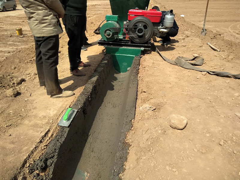 把機器放到挖好的溝模里面,啟動柴油機,打開攪拌功能,啟動油泵,料斗上料。機器開始自動完成渠道成型機工作。因為每個地方的使用的水渠和沙子不同,第一次試機的時候成型都不會太美觀。如下圖。